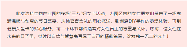 溫暖三月天,燦爛芳華。2025年3月7日,為慶祝國際婦女節(jié)來臨,潔特生物產(chǎn)業(yè)園開展了一系列豐富多彩的婦女節(jié)活動,形式多彩多樣,吸引了園區(qū)內(nèi)眾多女性朋友積極參與。